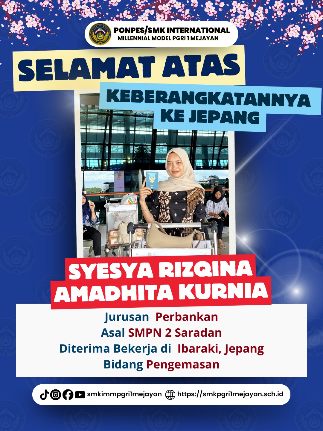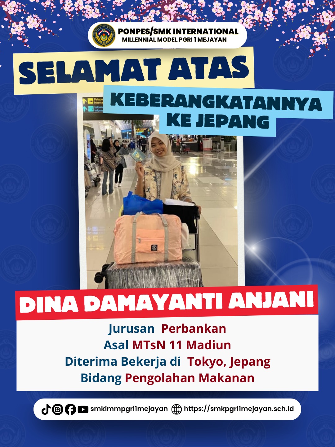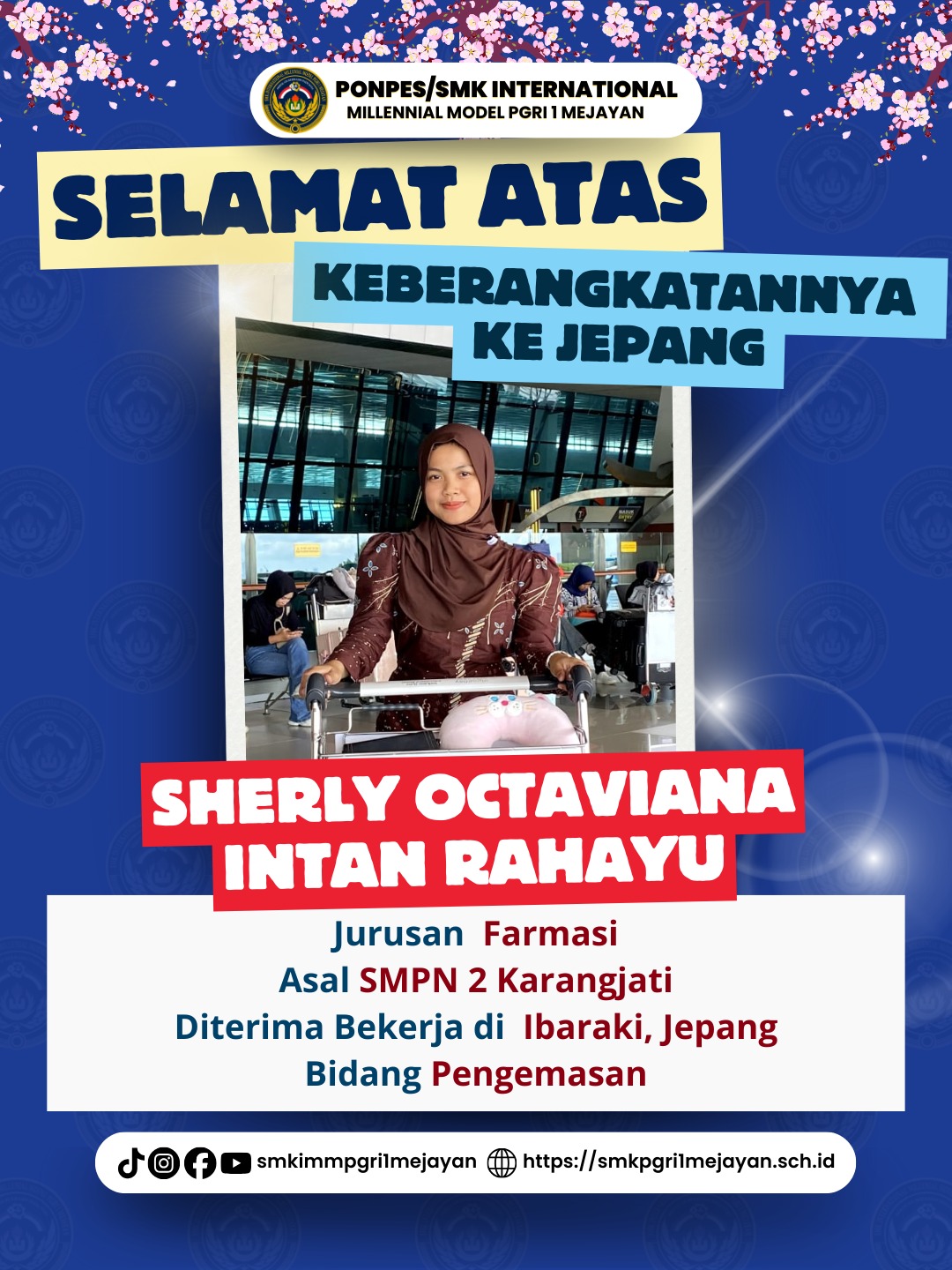 “Belajar di SMK International Millennial Model PGRI 1 Mejayan membuka jalan masa depan saya. Japanese Center melatih kami dari dasar, tidak hanya bahasa tetapi juga sikap kerja. Saya bangga bisa berangkat ke Jepang dan membanggakan keluarga.” pungkas Sherly Octaviana Intan Rahayu.