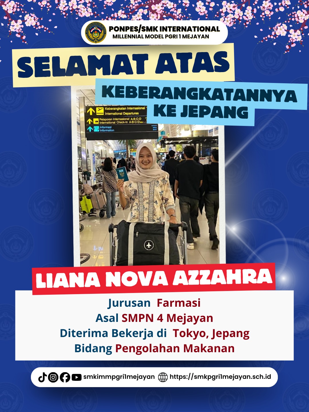Liana Nova Azzahra, alumni SMPN 4 Mejayan, lulusan jurusan Farmasi, bekerja di Tokyo, Jepang pada bidang Pengolahan Makanan.