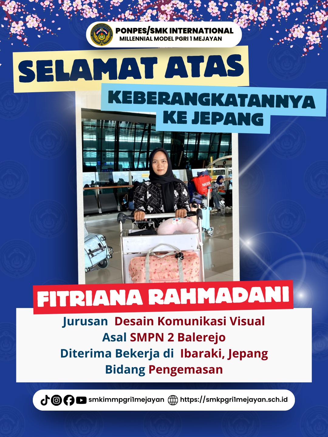 Fitriana Rahmadani, alumni SMPN 2 Balerejo, lulusan jurusan DKV, bekerja di Ibaraki, Jepang pada bidang Pengemasan.